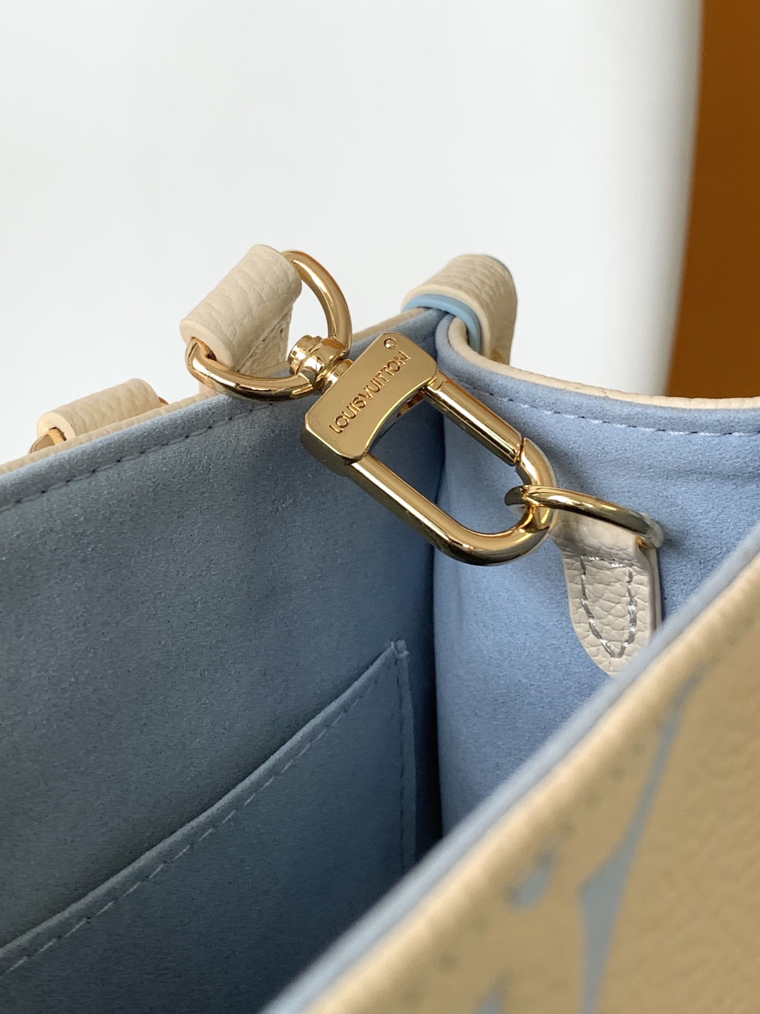 夏日の清らかな風との出会い、現代的な優雅さを演じる。このルイ・ヴィトンのミニ Onthego バッグは、清新で柔らかな生成色のキャビアレザーをキャンバスに、经典的なモノグラム柄を幻想的な淡いブルーで描き出しています。まるで青空が雲の上に映し出されたかのようで、優しく軽やかなファッションの息吹を放っています。